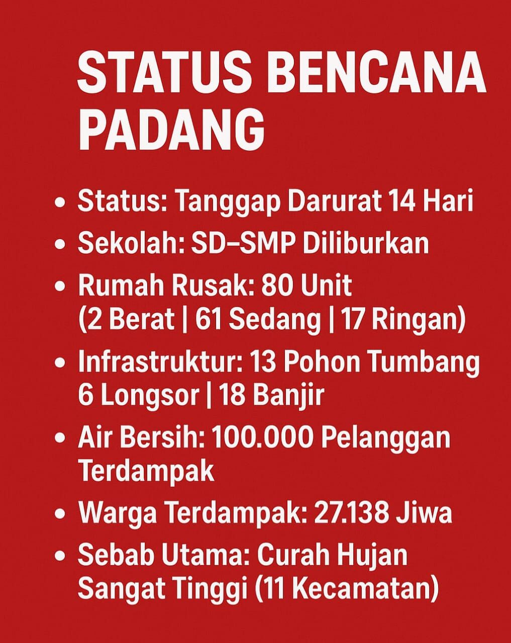 Sebelumnya, Wali Kota Padang Fadly Amran menetapkan status Tanggap Darurat Bencana selama 14 hari, terhitung sejak Selasa (25/11/2025), melalui Surat Keputusan Wali Kota Nomor 795. Status ini akan berlangsung hingga 8 Desember 2025.