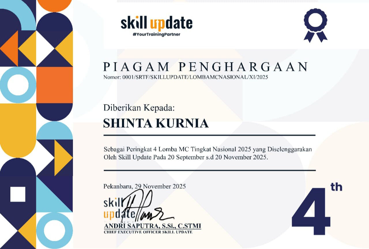 PADANG PARIAMAN | KlikGenZ — Prestasi membanggakan kembali ditorehkan generasi. Sinta Kurnia, S.IP, staf Humas Bawaslu Kabupaten Padang Pariaman, sukses mengharumkan nama daerah dengan meraih peringkat ke-4 tingkat nasional pada Lomba Master of Ceremony (MC) yang diselenggarakan oleh Skill Update pada 20 September – 20 November 2025.
