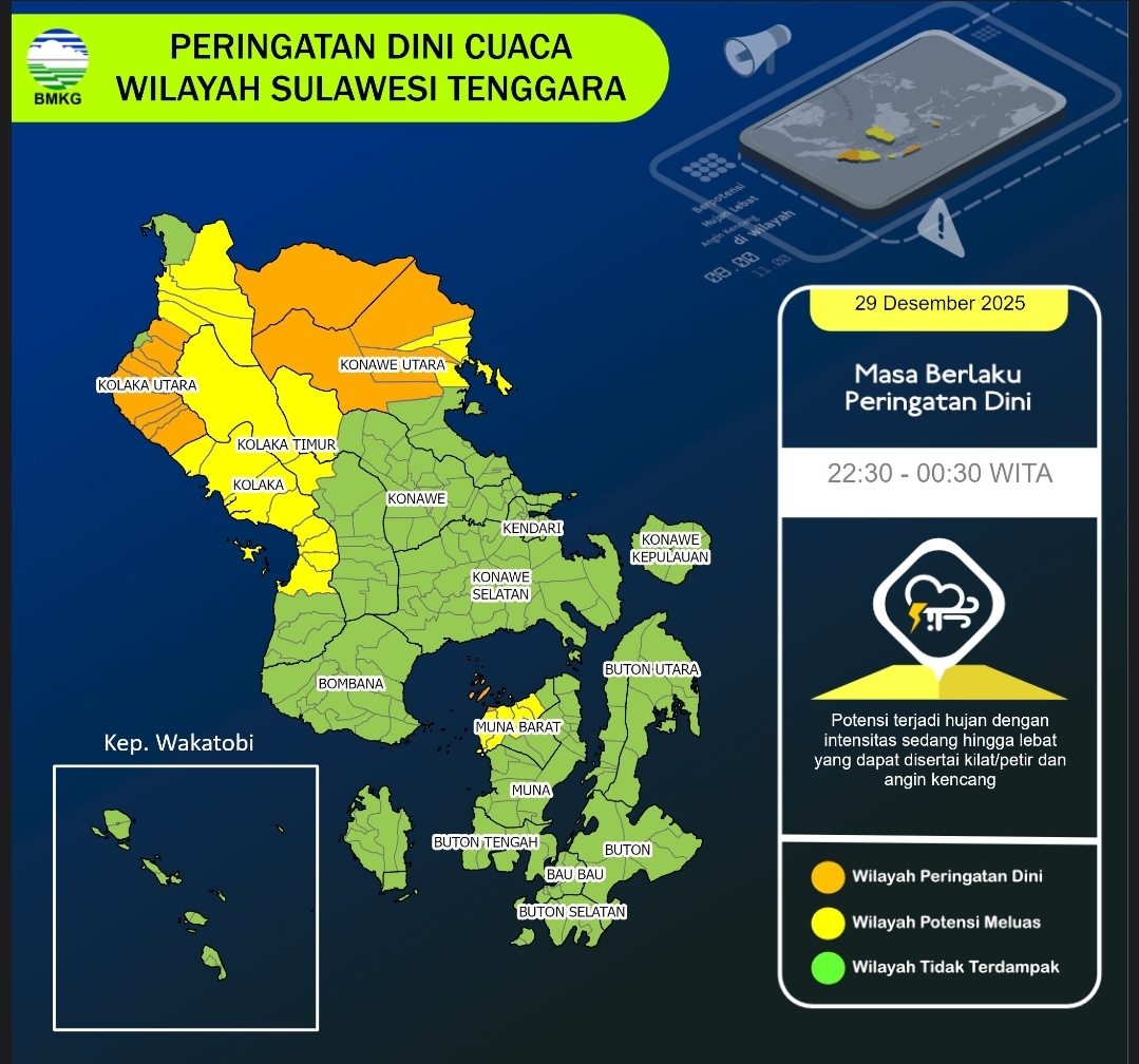 KENDARI | KLIKGENZ — Badan Meteorologi, Klimatologi, dan Geofisika (BMKG) Sulawesi Tenggara kembali mengeluarkan update peringatan dini cuaca pada Senin, 29 Desember 2025 pukul 22.10 WITA. Sejumlah wilayah di Sulawesi Tenggara berpotensi mengalami hujan dengan intensitas sedang hingga lebat, yang dapat disertai kilat/petir dan angin kencang.