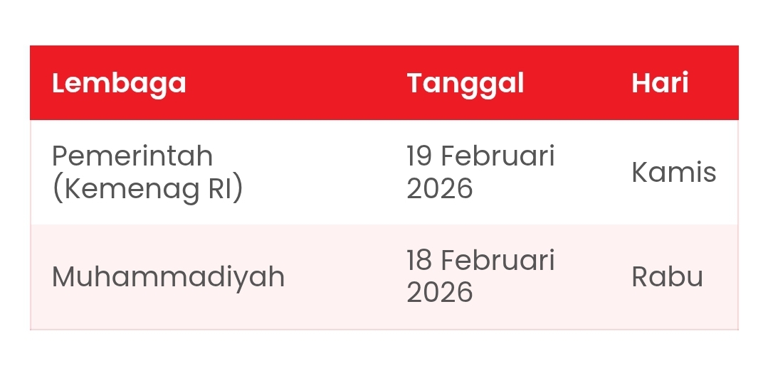 Sementara itu, Pimpinan Pusat Muhammadiyah telah menetapkan 1 Ramadhan 1447 H jatuh pada Rabu, 18 Februari 2026. Ketetapan ini tercantum dalam Maklumat Nomor 2/MLM/I.0/E/2025 serta mengacu pada Kalender Hijriah Global Tunggal (KHGT) yang menggunakan metode hisab astronomi.