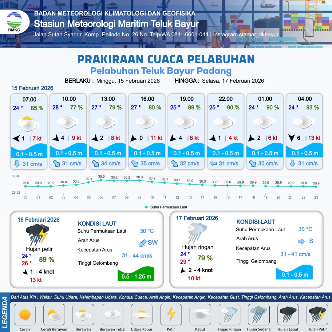 Memasuki 16–17 Februari, hujan petir diperkirakan meluas ke perairan Padang, Padang Pariaman, Pesisir Selatan, Barat Siberut, hingga Sipora. Kondisi ini berpotensi memicu gangguan jarak pandang dan meningkatkan risiko pelayaran, khususnya bagi kapal berukuran kecil.