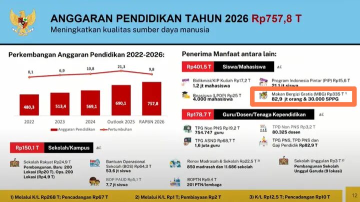 Sisanya berasal dari fungsi ekonomi sebesar Rp 19,7 triliun (6 persen) serta dana cadangan MBG senilai Rp 67 triliun (20 persen). Program ini ditargetkan menjangkau 82,9 juta siswa melalui sekitar 30.000 Satuan Pelayanan Pemenuhan Gizi (SPPG) di seluruh Indonesia.