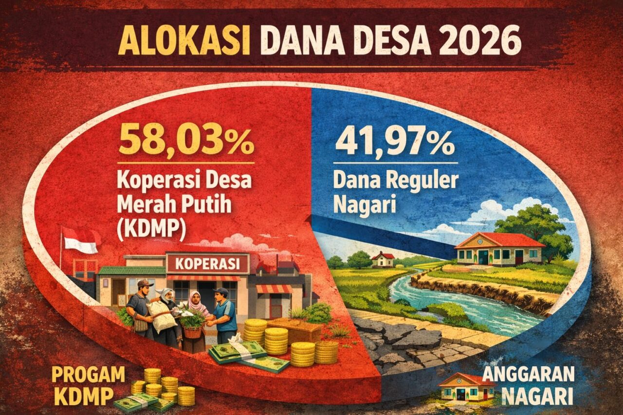 EDITORIAL | KLIKGENZ – Kebijakan baru pemerintah pusat melalui Kementerian Keuangan Republik Indonesia kembali menguji daya tahan pemerintahan nagari. Lewat Peraturan Menteri Keuangan Nomor 7 Tahun 2026, lebih dari separuh Dana Desa 2026 tepatnya 58,03 persen dialihkan untuk program Koperasi Desa Merah Putih (KDMP).