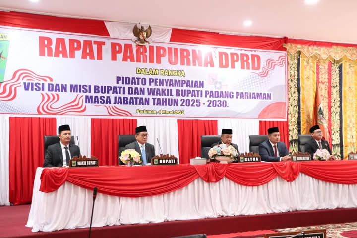 Padang Pariaman, KlikGenZ – Bupati Padang Pariaman, John Kenedy Azis, menyampaikan pidato politiknya bersama Wakil Bupati untuk periode 2025-2030. Acara ini dihadiri oleh Ketua DPRD beserta anggota, unsur Forkopimda, Sekretaris Daerah, serta para pejabat di lingkungan Pemerintah Kabupaten Padang Pariaman di ruang sidang DPRD Selasa (4/2/2025).