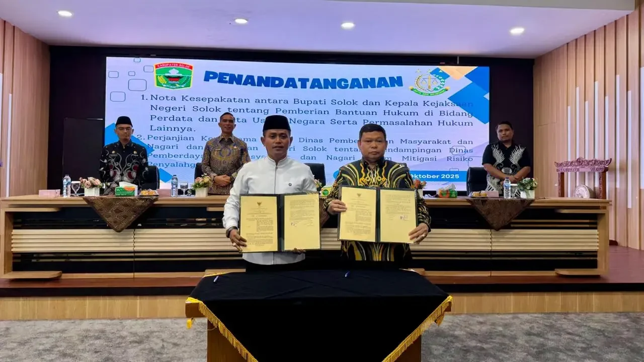 KLIKGENZ.Com – Pemerintah Kabupaten Solok bersama Kejaksaan Negeri Solok menandatangani Nota Kesepakatan dan Perjanjian Kerja Sama terkait pemberian bantuan hukum di bidang perdata, tata usaha negara, serta pembimbingan dalam program Jaga Nagari. Kegiatan ini berlangsung di Aula Gedung C, Sekretariat Daerah Kabupaten Solok, pada Jumat (03/10/25).