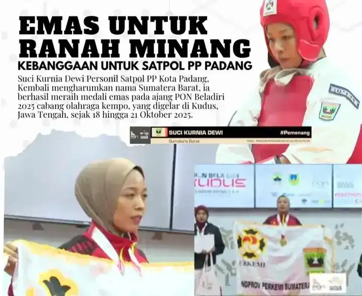 KLIKGENZ.Com — Kembali mengharumkan nama Sumatera Barat, Personil Satpol PP Kota Padang, Suci Kurnia Dewi, berhasil meraih medali emas pada ajang PON Beladiri 2025 cabang olahraga kempo, yang digelar di Kudus, Jawa Tengah, sejak 18 hingga 21 Oktober 2025.
