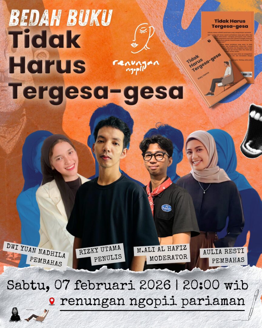 Bedah buku yang digelar pada 7 Februari 2026 ini menghadirkan M. Ali Al Hafiz sebagai moderator, dengan Dwi Yuan Nadhila dan Aulia Resti sebagai pembahas. Diskusi mengulas isi buku yang mengajak pembaca untuk melambat, berdamai dengan waktu, serta menemukan ketenangan di tengah ritme kehidupan yang serba cepat.
